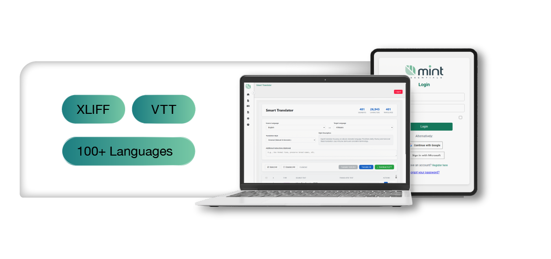 No, your content is not used to train AI models. All translation takes place within Mint Essentials and is covered by a clear, up-to-date privacy policy.